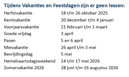 Tijdens/rond de feestdagen en de schoolvakanties zijn er geen lessen of aangepaste lessen, zie de jaarkalender en de nieuwsberichten.